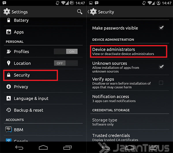 - Setelah terinstal, masuk ke menu Settings > Security > Device administators.